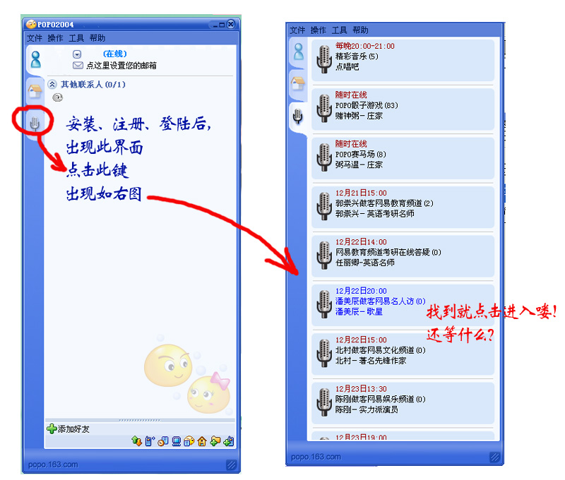 在popo软件中进入聊天室的示意图